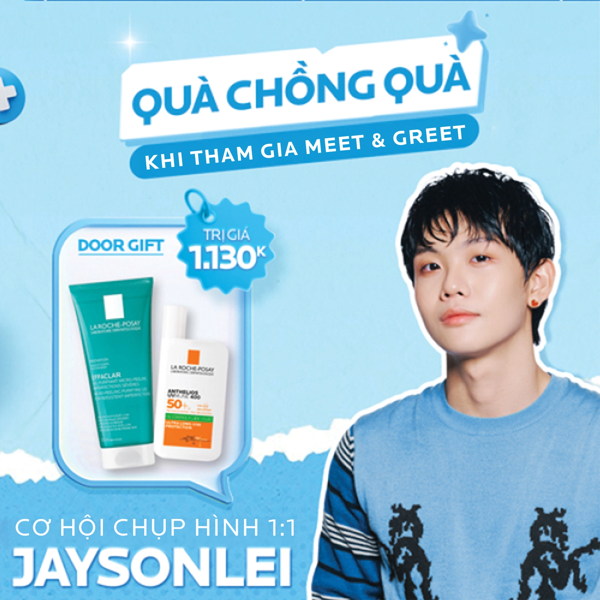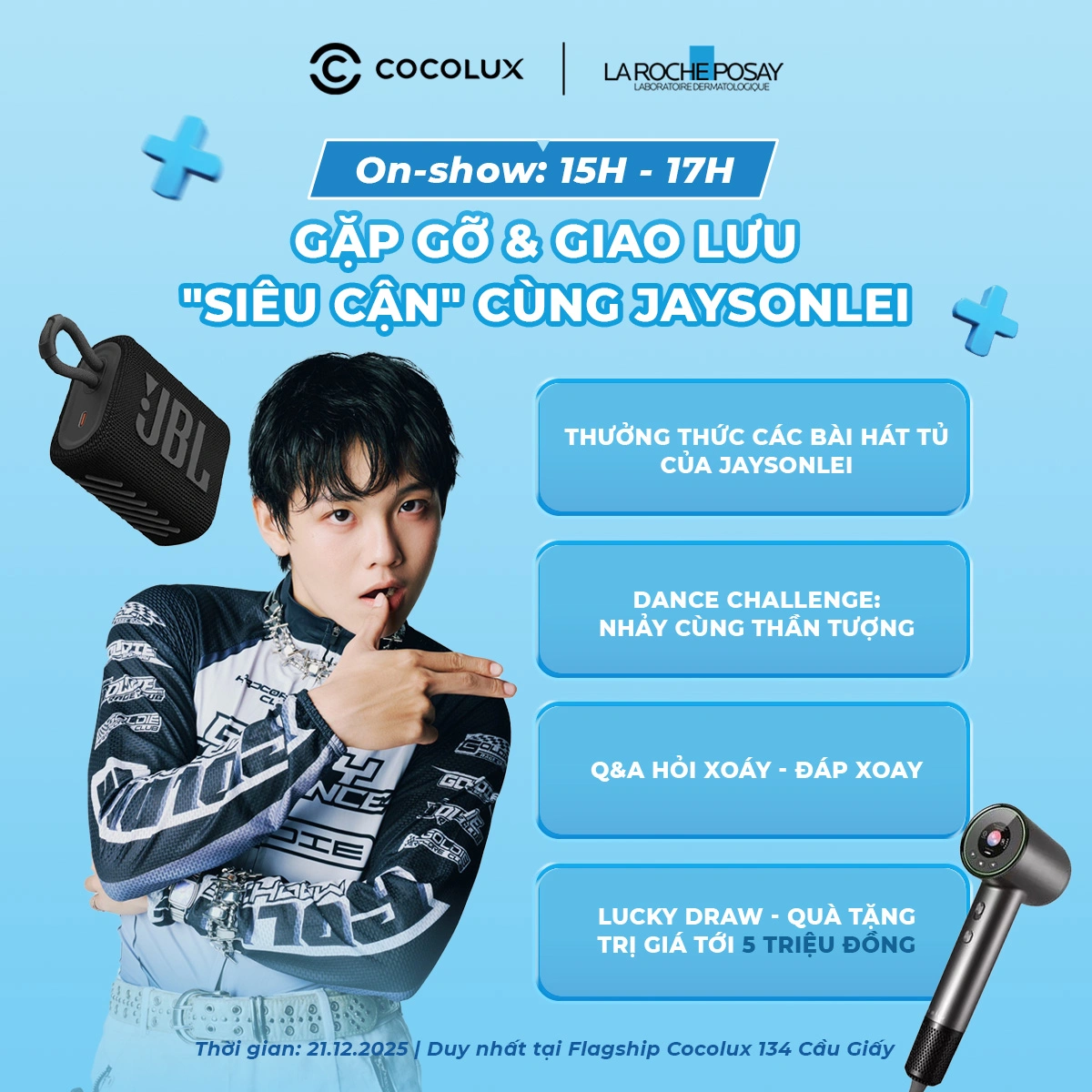 Meet & Greet Jaysonlei tại Flagship Cocolux 134 Cầu Giấy chỉ diễn ra trong 1 ngày duy nhất. Một buổi chiều để gặp gỡ, trải nghiệm và lưu giữ những kỷ niệm thật gần cùng Anh Trai Jaysonlei trong không gian được tạo nên bởi Cocolux x La Roche-Posay. Lưu ngay lịch hẹn 21.12.2025 và đến sớm để không bỏ lỡ những khoảnh khắc đáng nhớ tại sự kiện bạn nhé!
