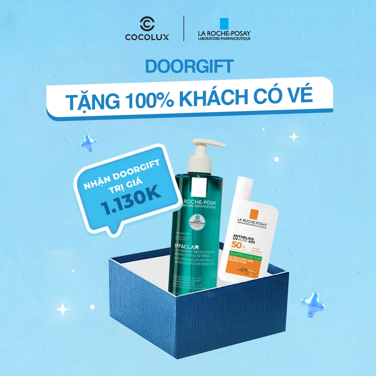 Tất cả khách hàng sở hữu vé tham dự sự kiện, đều được nhận phần quà Doorgift trị giá 1.130K từ Cocolux x La Roche-Posay, như một lời cảm ơn dành cho khách tham dự.