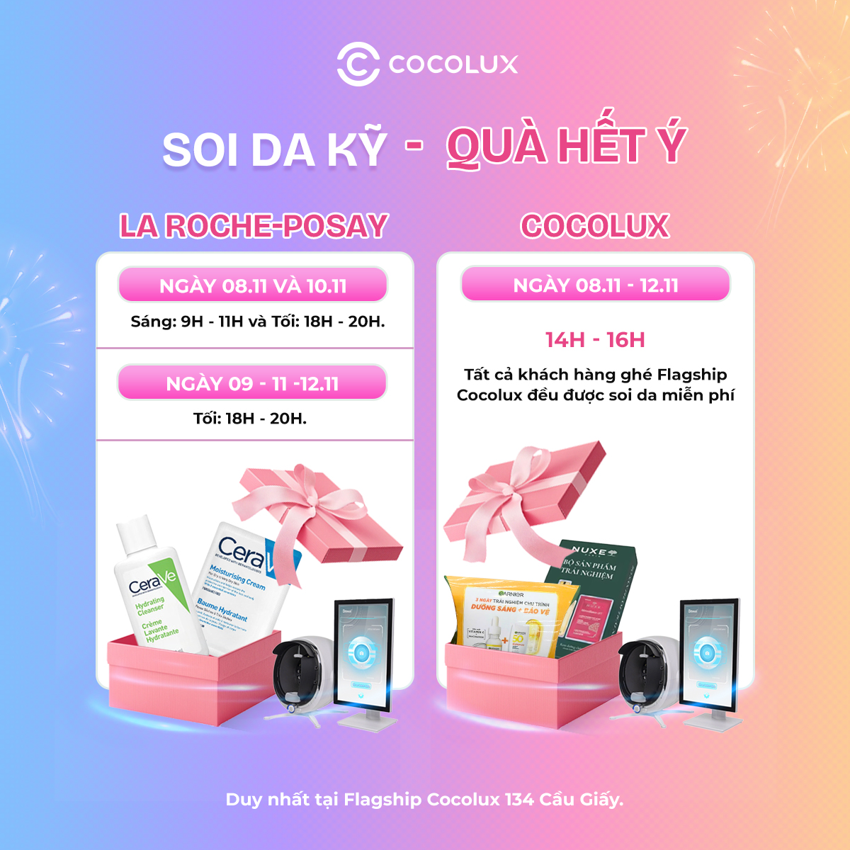 - 14H - 16H trong 5 ngày: 08.11 - 12.11, tất cả khách hàng ghé Flagship Cocolux đều được soi da miễn phí và được tặng sample bất kỳ.