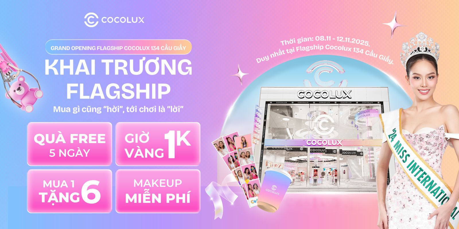 Flagship Cocolux 134 Cầu Giấy chính thức khai trương với 5 ngày đại tiệc (08.11 - 12.11) bùng nổ hoạt động cực chill, deal cực hời và quà tặng cực xịn. Đặc biệt, có sự đồng hành của Hoa hậu Thanh Thủy – biểu tượng nhan sắc Việt, hứa hẹn mang đến không gian làm đẹp rực rỡ và sự kiện “cháy” nhất tháng 11!