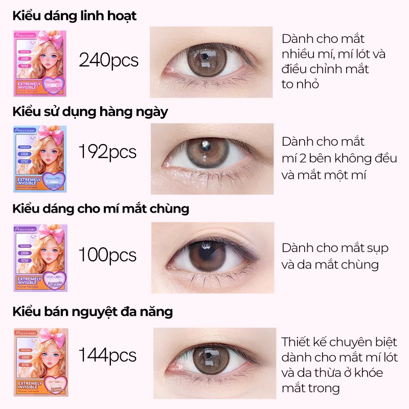 Kích mí có thể sử dụng linh hoạt cho nhiều dáng mí khác nhau - từ mí lót, mí ẩn đến mí không đều - mang lại hiệu quả thẩm mỹ cao mà vẫn giữ sự thoải mái tối đa cho vùng da mắt.