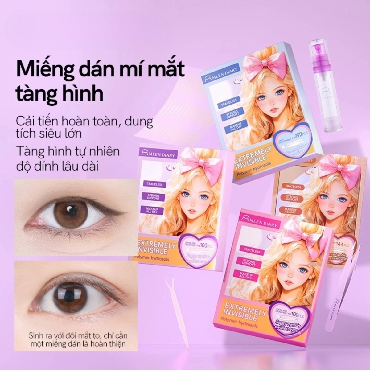 Kích Mí Mlen Diary là trợ thủ đắc lực giúp bạn sở hữu đôi mắt to tròn, có chiều sâu và nếp mí rõ ràng chỉ trong vài giây. Với chất liệu film trong suốt mỏng nhẹ và keo dính bền chắc, sản phẩm giúp tạo nếp mí tự nhiên mà không để lộ dấu vết trang điểm.