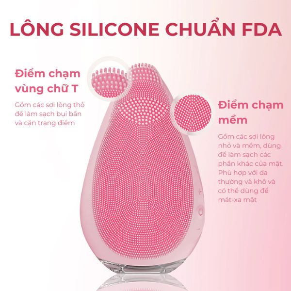 Sản phẩm được làm từ chất liệu silicon được sử dụng trong ngành thực phẩm, có độ lành tính và an toàn cao. Thêm vào đó, sản phẩm còn có thiết kế thông minh với thiết kế đầu cong S-Shape, cho máy ôm sát khuôn mặt người Việt để dễ dàng làm sạch. Ngoài ra, máy còn có điểm chạm cho vùng chữ T, giúp dễ dàng làm sạch trên vùng da này.