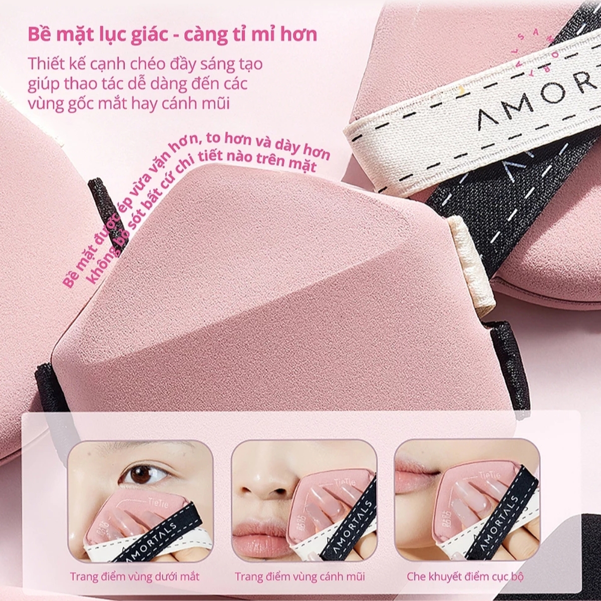 Bộ mút tán nền Amortals Tie Tie Powder Puff Set được thiết kế dành riêng cho việc tán phấn nền, phấn phủ hoặc phấn bột một cách chuyên nghiệp. Set gồm 3 mút: 2 bông mút hình lục giác và 1 bông mút hình giọt nước - đáp ứng đa góc khuôn mặt và nhiều loại phấn khác nhau.