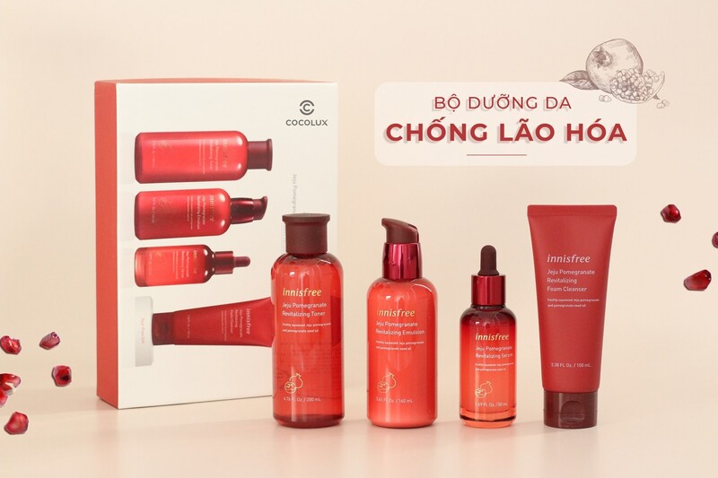 Set chống lão hóa Lựu Đỏ Innisfree Jeju Pomegranate Revitalizing, Trong trái lựu đỏ chứa thành phần vitamin C dồi dào hỗ trợ việc chống oxy hóa và lão hóa trên làn da, thúc đẩy tăng cường tái tạo collagen. Ngoài ra, những chị em đang lo lắng vì mụn thì cũng hãy yên tâm nhé sử dụng các sản phẩm chứa thành phần lựu đỏ vì vitamin C trong lựu giúp điều tiết bã nhờn, hạn chế dầu thừa trên da gây mụn trứng cá.