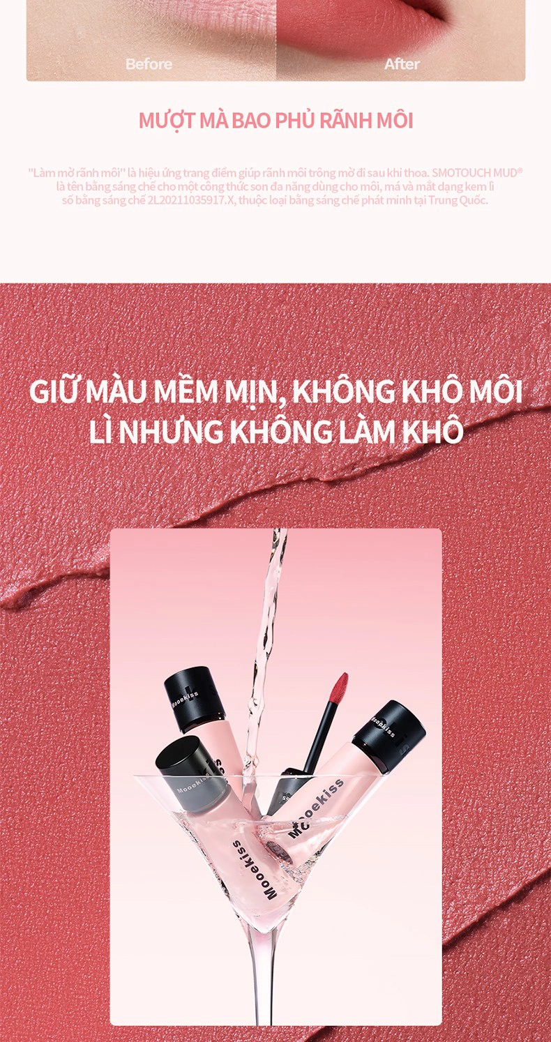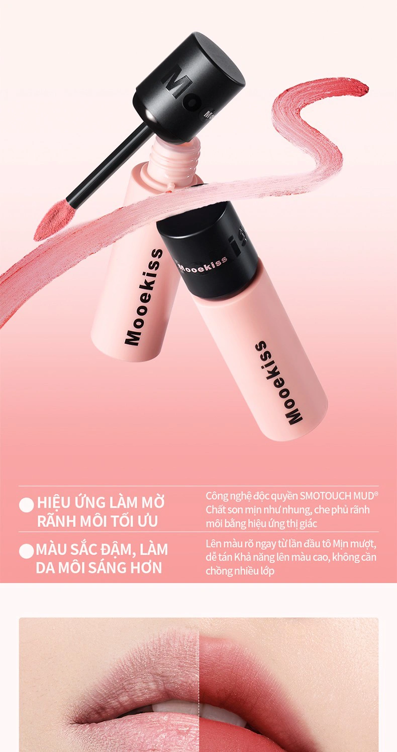 Son Kem Mooekiss Velvet Lip Mud là lựa chọn hoàn hảo dành cho những cô nàng yêu thích phong cách trang điểm hiện đại, tự nhiên nhưng vẫn đủ cuốn hút. Lấy cảm hứng từ xu hướng “lip mud” đang làm mưa làm gió tại các thị trường làm đẹp châu Á, Mooekiss mang đến dòng son kem lì với hiệu ứng velvet mịn như nhung, tạo cảm giác đôi môi mềm mại, mờ ảo và đầy tinh tế ngay từ lần chạm đầu tiên.