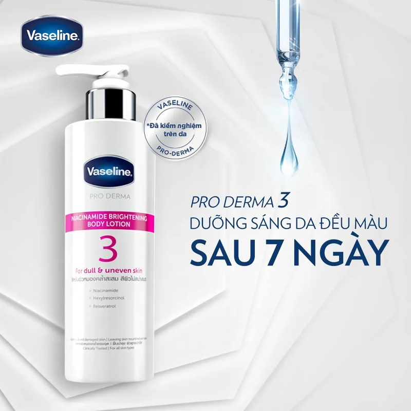 • Vaseline Pro Derma 3 Niacinamide Brightening Body Lotion (màu hồng): chứa Niacinamide 5% giúp làm sáng da, dưỡng trắng da và khắc phục tình trạng da bị thâm sạm, da không đều màu; Resveratrol có tác dụng chống oxy hoá và hỗ trợ làm sáng da.