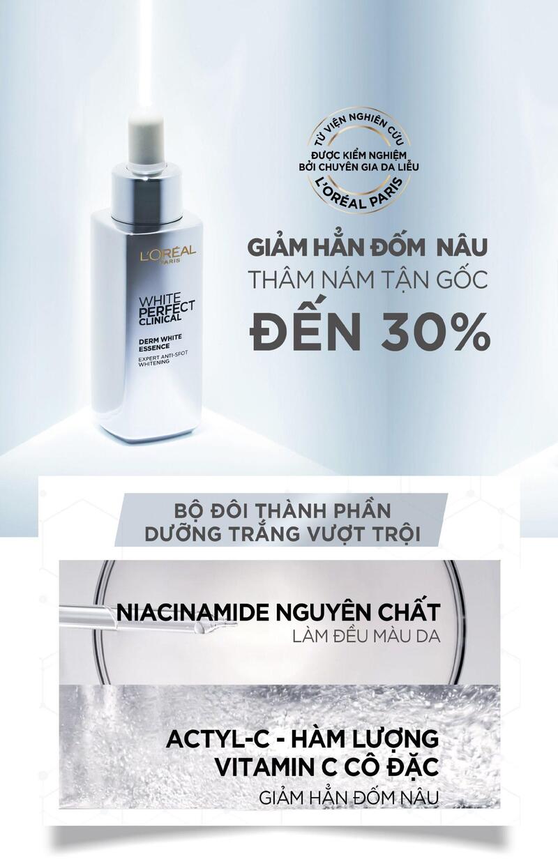 Sử dụng Tinh chất White Perfect Clinical Loreal 30ml được coi là phương pháp làm trắng da an toàn và chuyên sâu. Sản phẩm có công dụng chính là làm mờ, làm giảm các vết thâm mụn, đốm nâu cho da đều màu và trắng sáng. Đặc biệt, nhờ kết hợp 3 hoạt chất ưu việt bao gồm: Actyl - C có tính làm trắng hiệu quả hơn Vitamin CG, cùng Adenosine với khả năng kiểm soát việc sản sinh sắc tố melanin ngăn thâm mụn và Fibrelastyl làm tính tính đàn hồi cả da, chống vàng da hiệu quả.